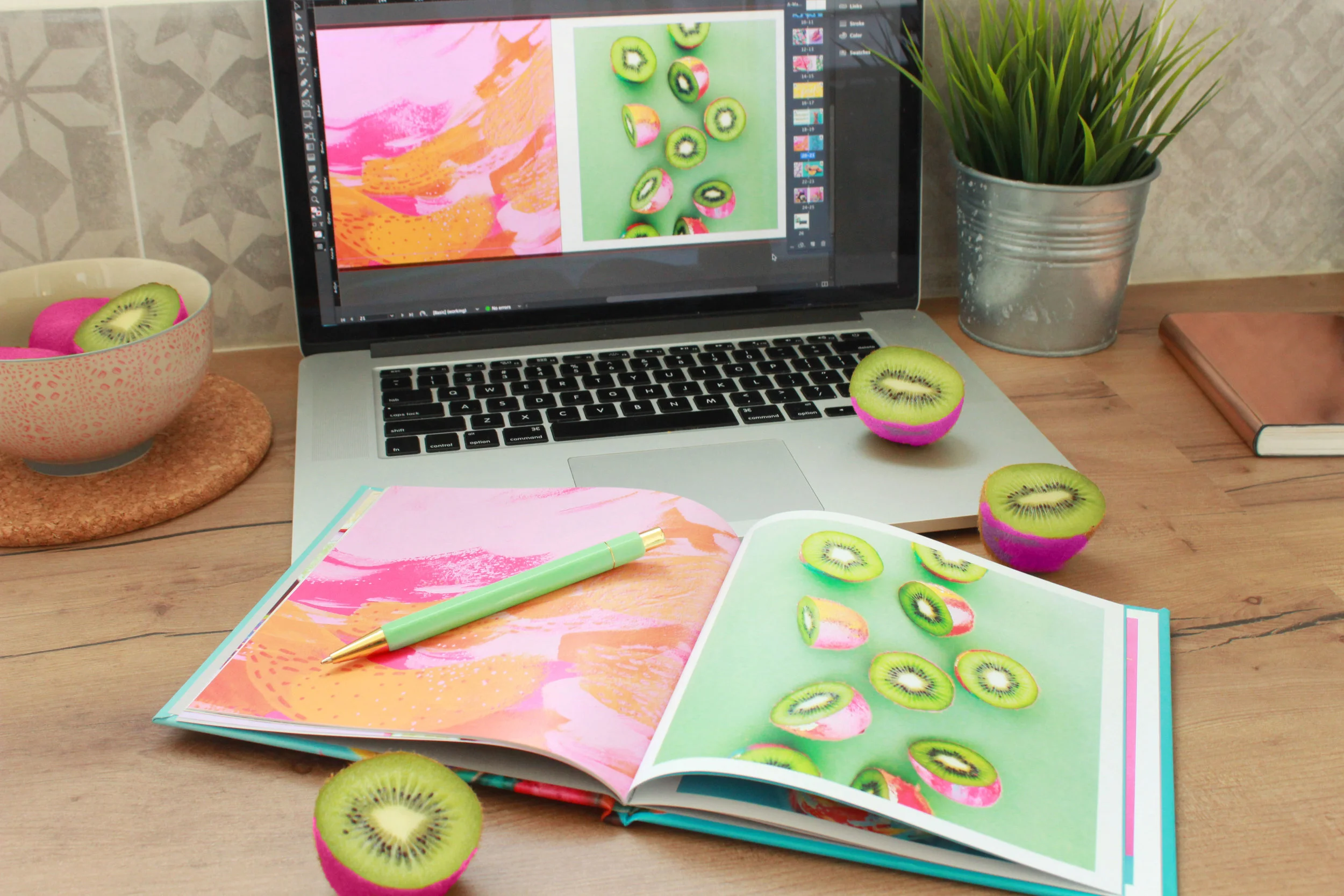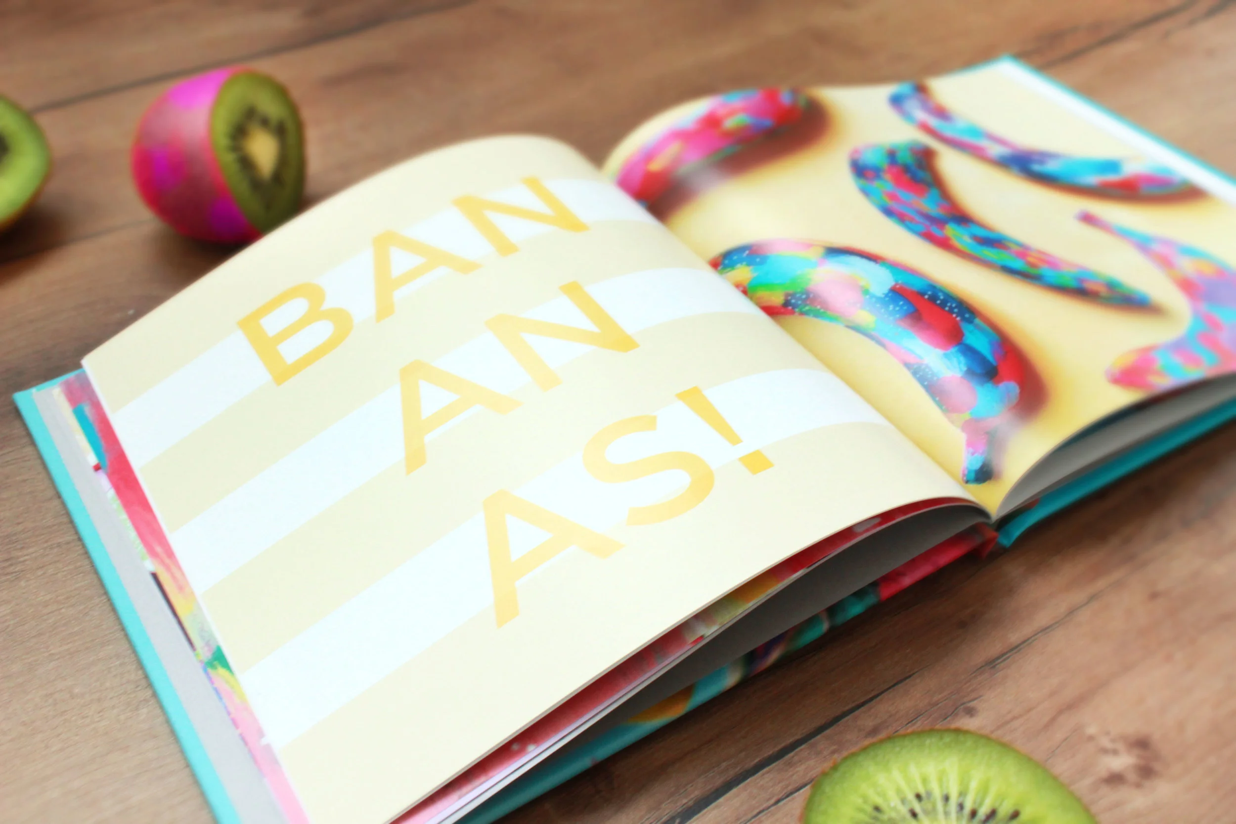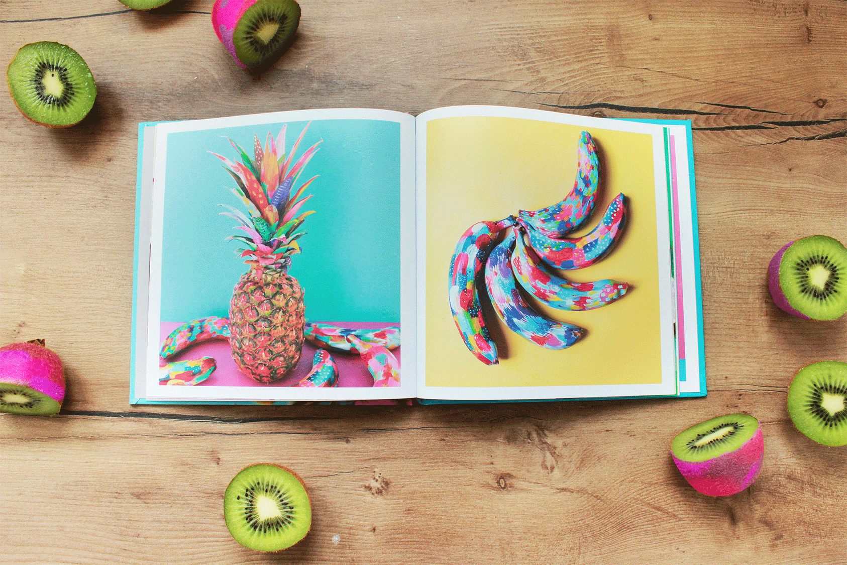 I had fun dreaming up ideas for this project! I knew I wanted to make a fun artbook that someone might want to display on their coffee table. Also, I wanted the finished piece to be colorful and energetic, so I decided the subject of my book would feature my vibrantly hand painted fruit photo series. I even painted and shot two new fruits just to round out the book!