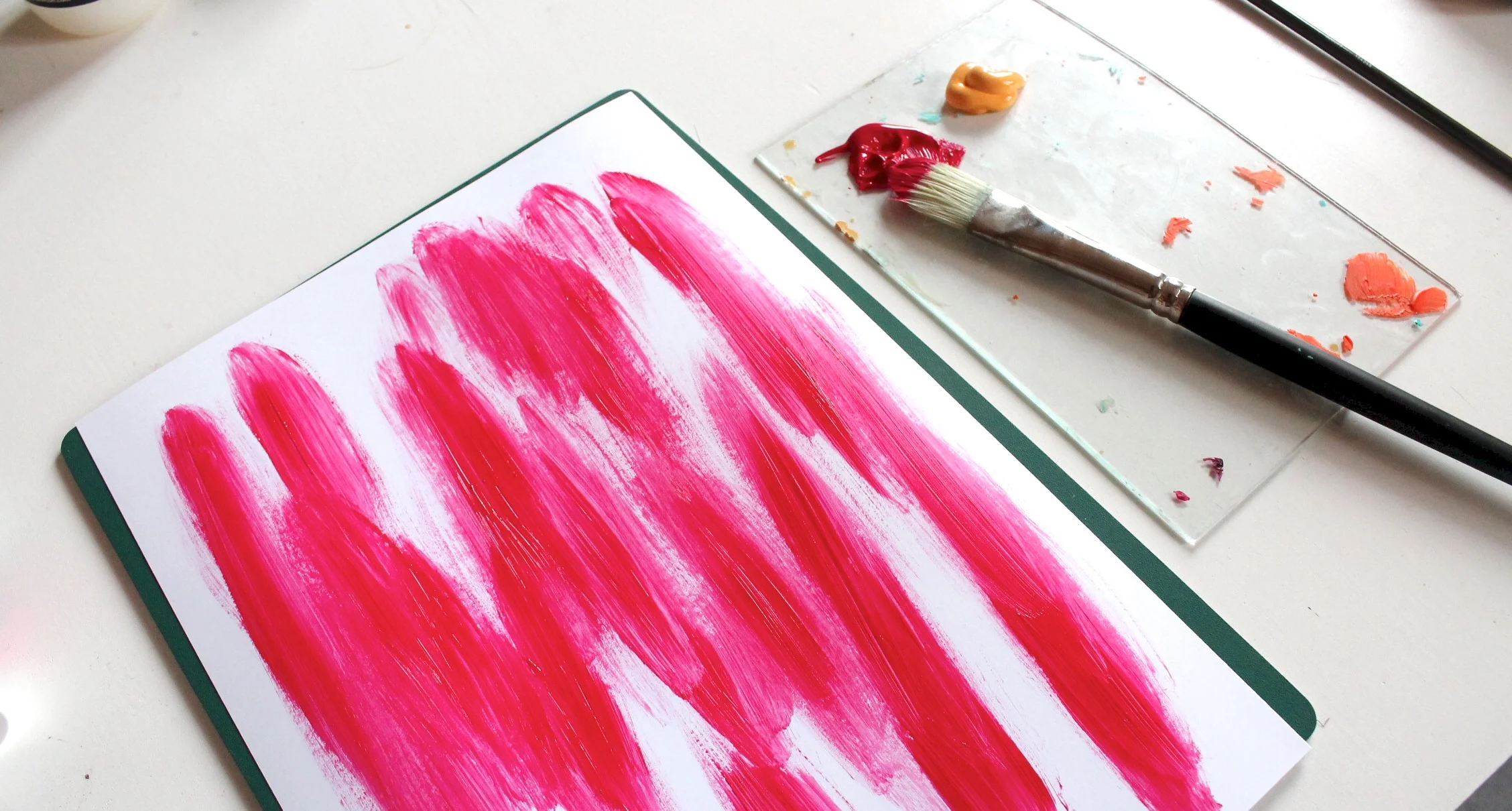 Take your printed business card pages and place the page text side down. Start with one paint color and freely paint strokes across the back side of the page. I like to use warm colors as my base, but feel free to use any color your heart desires :)
