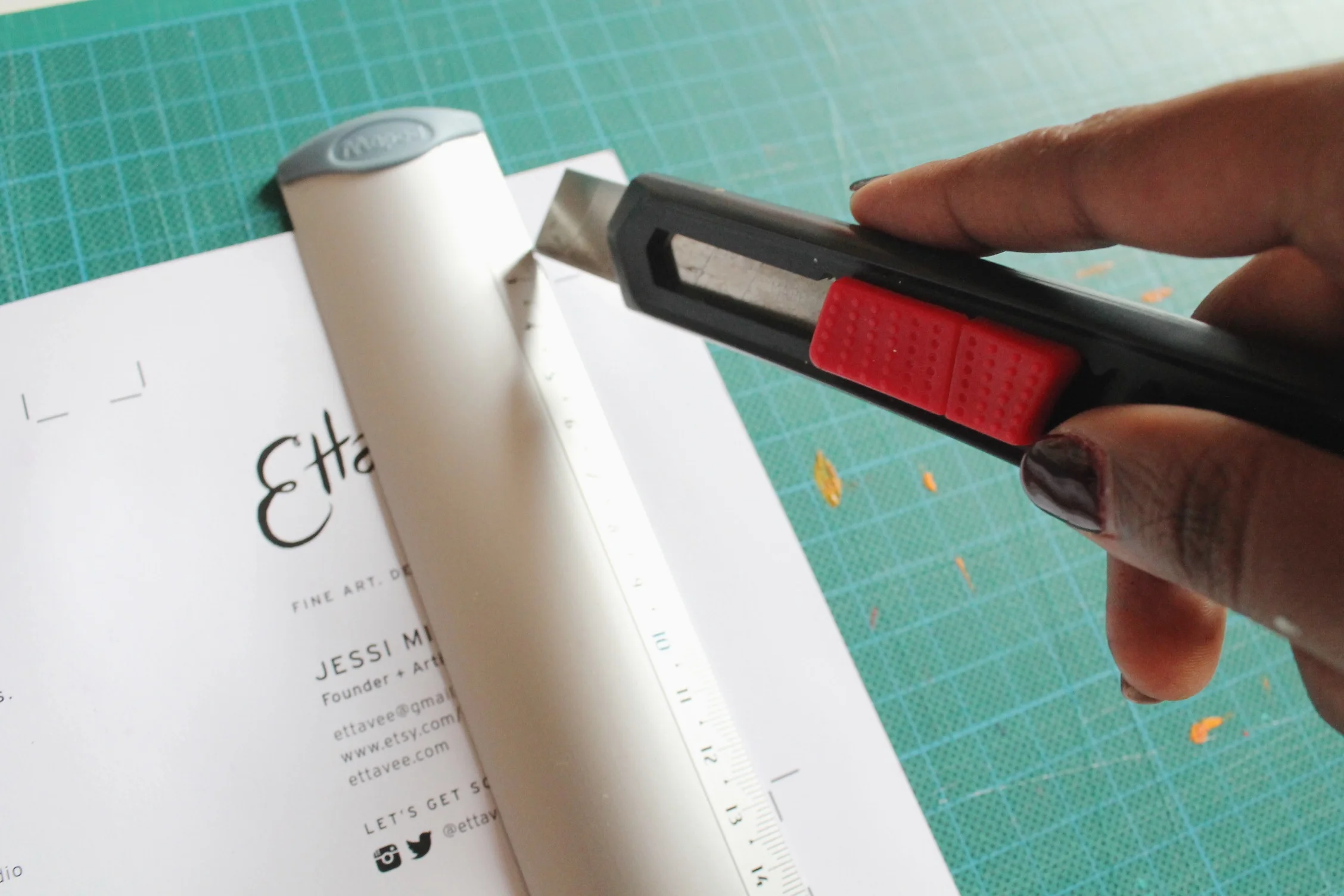 Once your page is fully dry, place your page text side up. Using the crop marks as your guide, place align your ruler with the crop marks and cut horizontally and vertically.