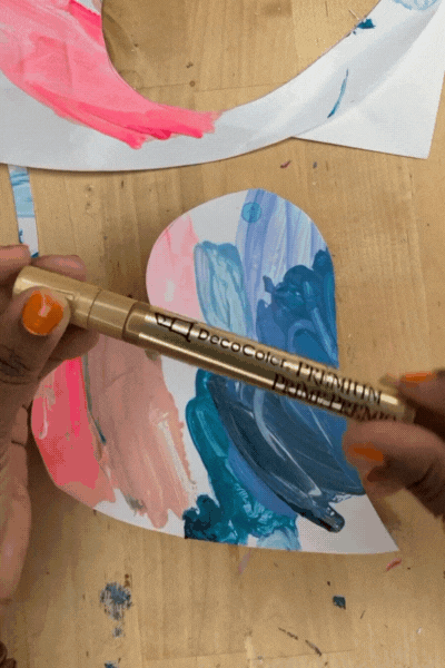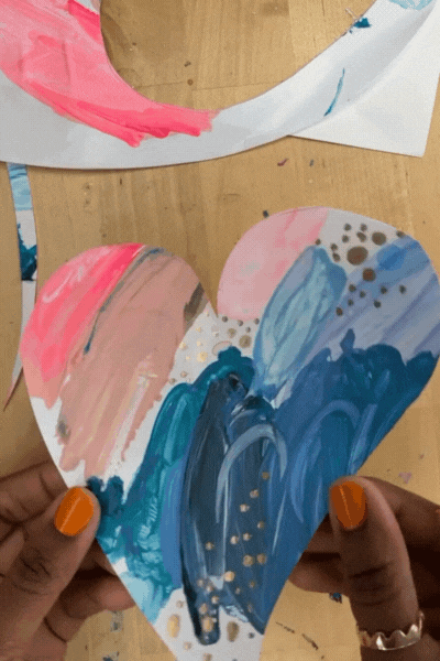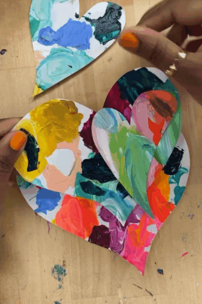 Now that you have your repurposed materials or your abstract painting on paper, it’s time to cut it into the shape of a heart! I love the whimsical look of a heart-shaped Valentine. It makes it feel so much more playful and fun than a traditional card shape!