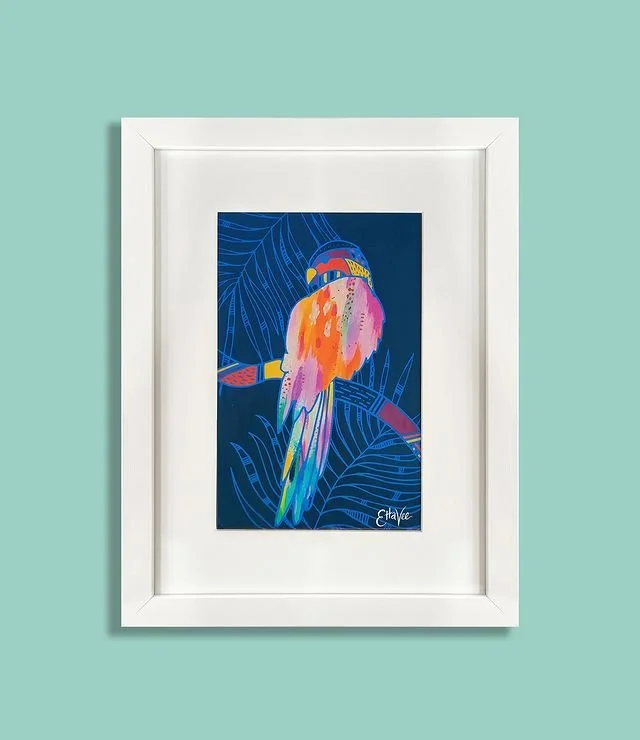Is tropical more your vibe? This colorful parrot would be a fabulous addition to your walls! With a dark background, the parrot really pops off the page. Be transported to the vibrancy of the tropics with “Vibrant Parrot.”