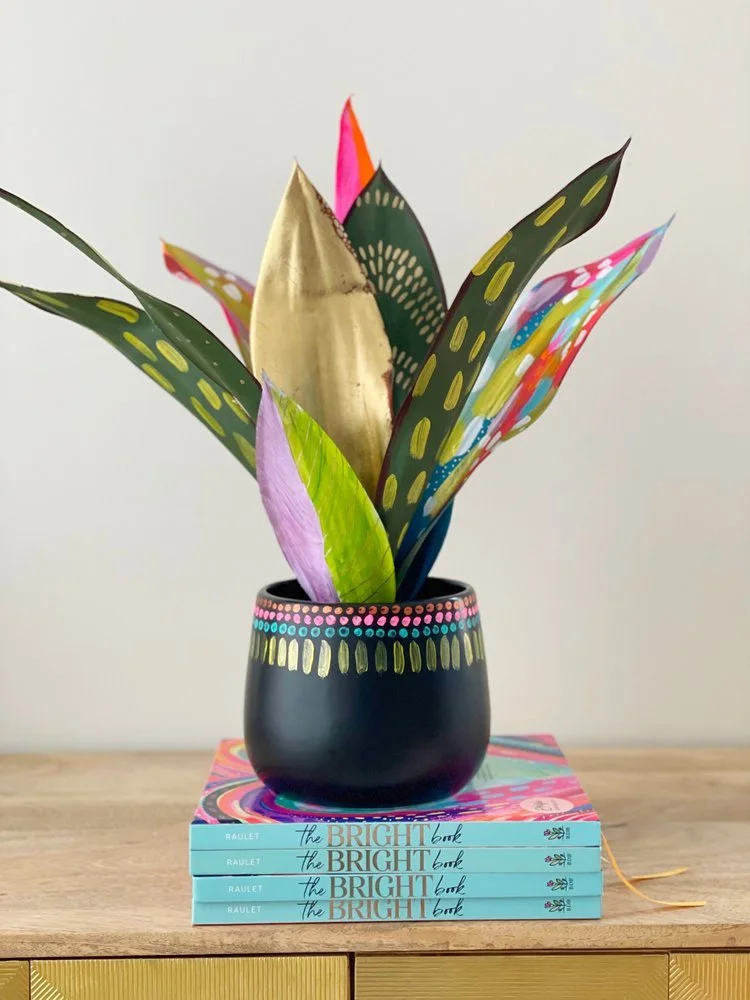 Here’s one you might not have expected! Recently, I was dreaming up the concept for a new mini collection, and I thought it would be so cool to paint on artificial plants! The art would last forever and be a fun way to bring a new level of joy and vibrancy to your space. I’m so glad I decided to explore this new surface. The result was incredible and I just love how they turned out!