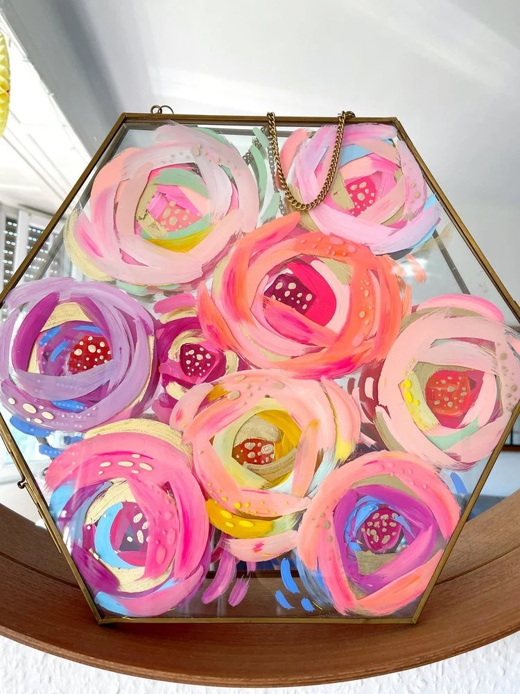 One of my absolute favorite surfaces for acrylic painting is glass! I’ve built a portfolio full of glass pieces of all shapes and sizes. I use glass frames like these so that there are multiple layers of glass to work with which allows me to get some incredible depth and texture in my glass works.