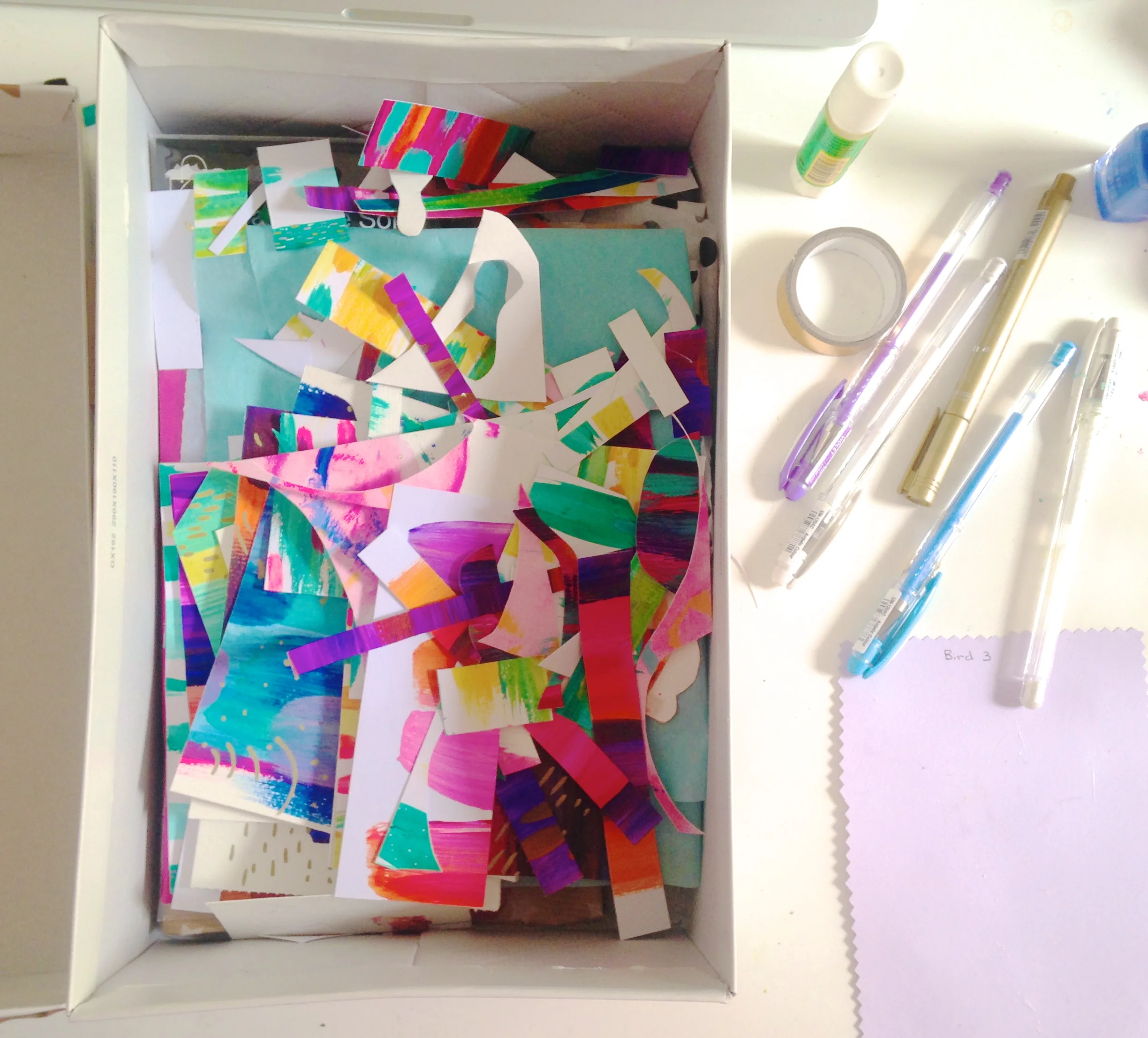 Instead of throwing away scrap paper, I've saved it all in a shoe box. See all the colors sitting in the box inspired me to create some fun new pieces.