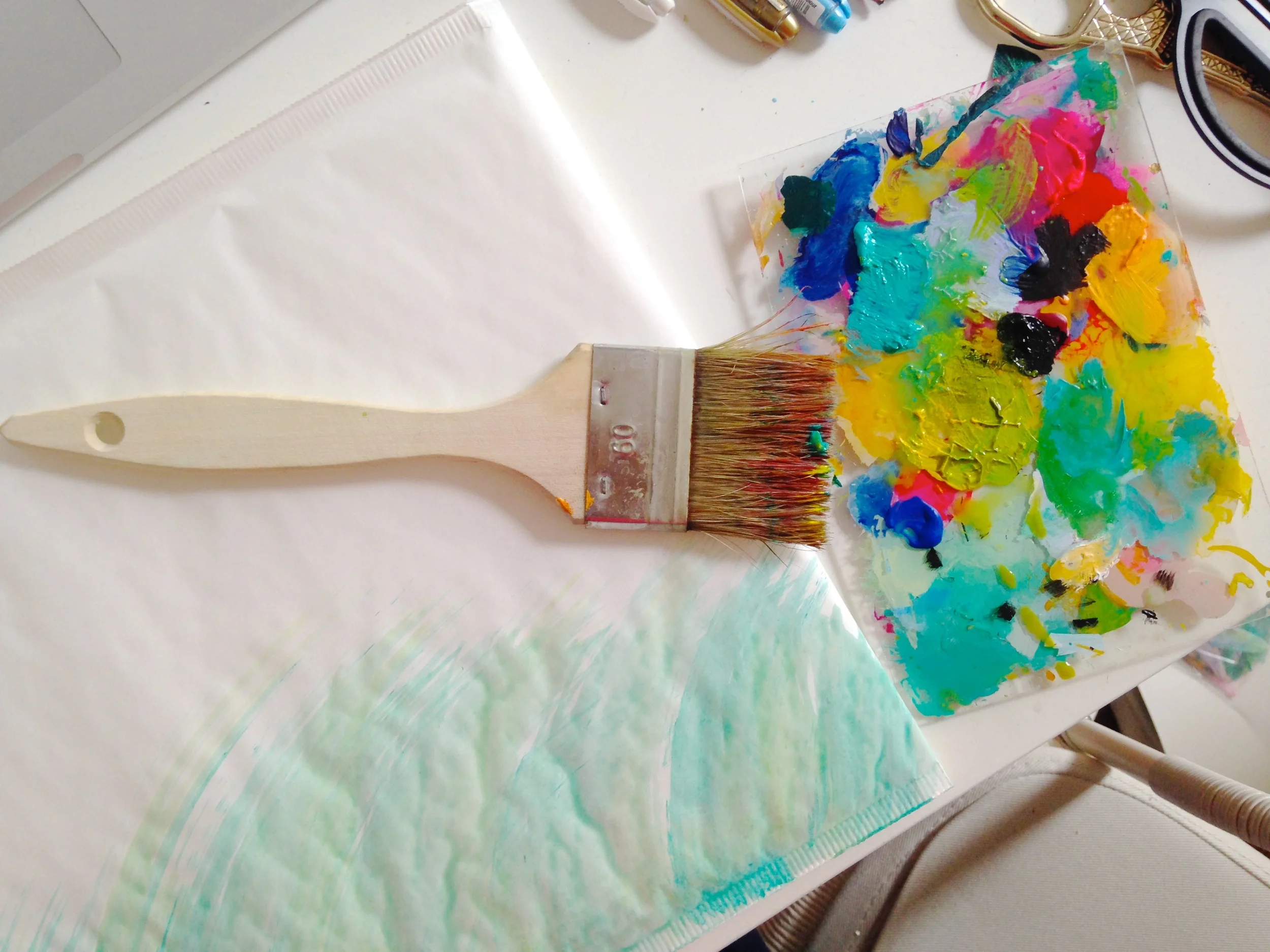 There have been many times I've washed leftover paint down the sink after finishing a piece. Such a shame to let all those pretty colors go to waste! Now, when I have leftover paint, i'll use what's left to decorate the envelopes I use to ship orders in. Not only am I wasting less paint, but my collectors LOVE receiving their colorful packages in the mail!