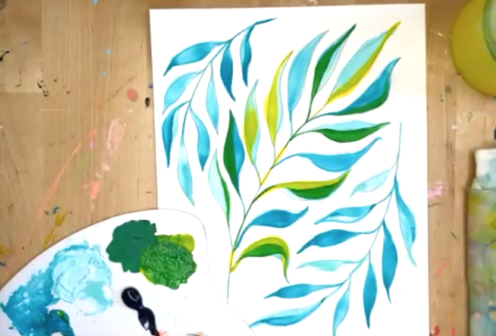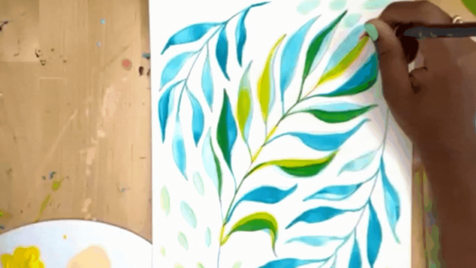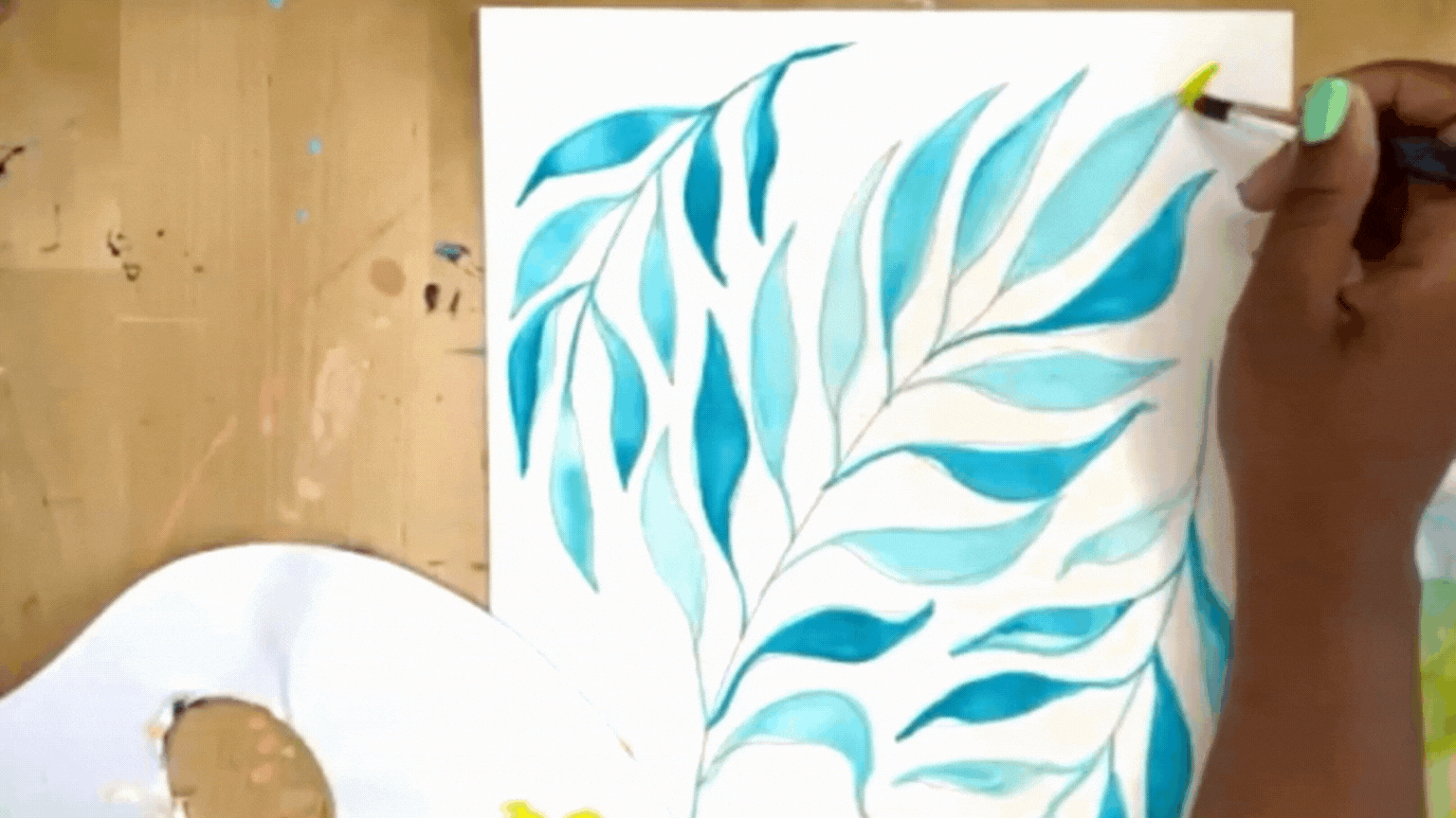 While you’re waiting on the center leaf to dry, add a few flourishes to bring the composition together! I added a few brushstrokes to my piece to increase the movement of the piece and fill in the gaps between the outer and inner leaves. Make sure your brushstrokes follow the movement of the leaves and tie things together! I used light turquoise and green to match the color of the leaves, but feel free to make a creative choice and use any color you’d like!
