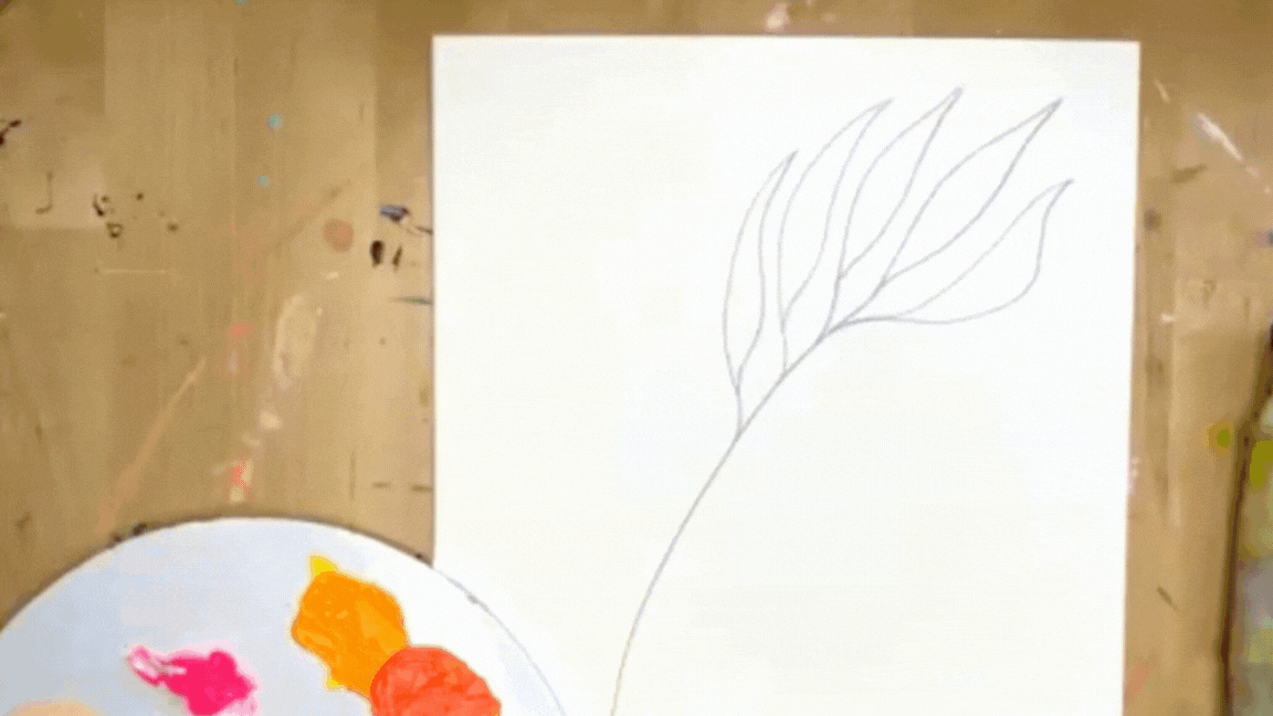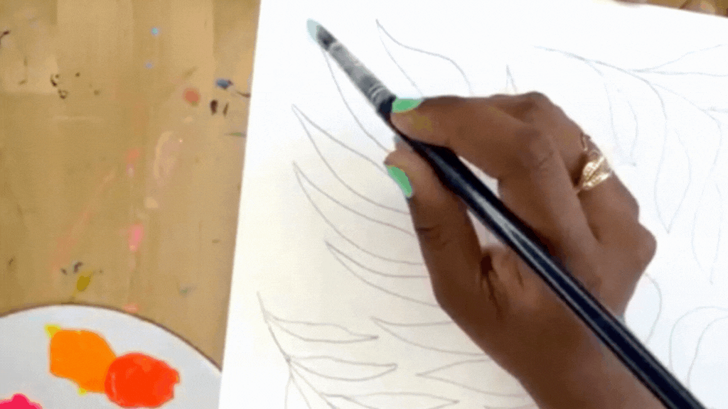 The composition is looking a little dark now, so let’s bring it back to the bright and vibrant space with some fun highlights! I’m going to use peach and orange to add bright hits and highlights to the leaf. As you’re layering the brushstrokes, make sure to leave parts of the existing colors peeking out. This is what’s going to add depth and make this colorful masterpiece truly stand out!
