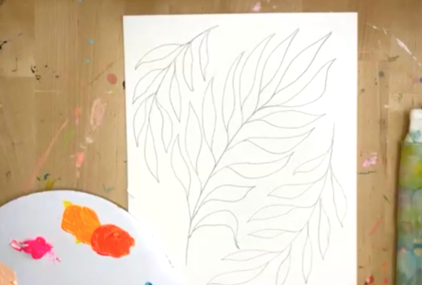 Now it’s time to sketch the motif! Draw a large leaf in the middle of the page with two smaller leaves curving around it.