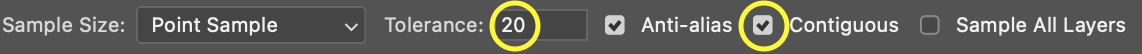 Then check the “Tolerance” setting. I like to set mine to around 20. Tolerance indicates how sensitive the selection tool is going to be. Higher tolerance means it will be looser with its selection and lower tolerance means that it will be more selective! If you ever have any issues with your selection, play around with the tolerance number until you get it just right.
