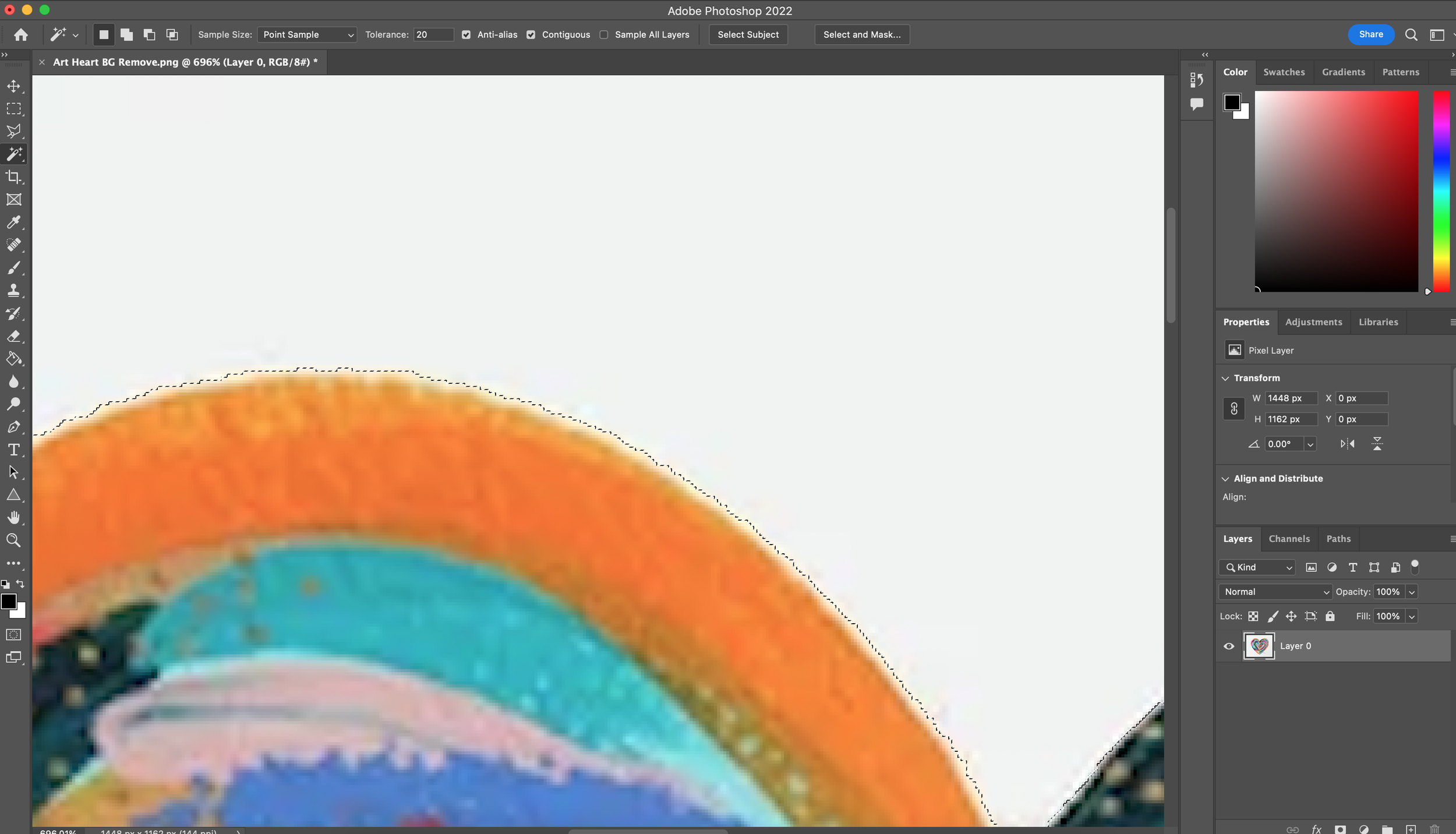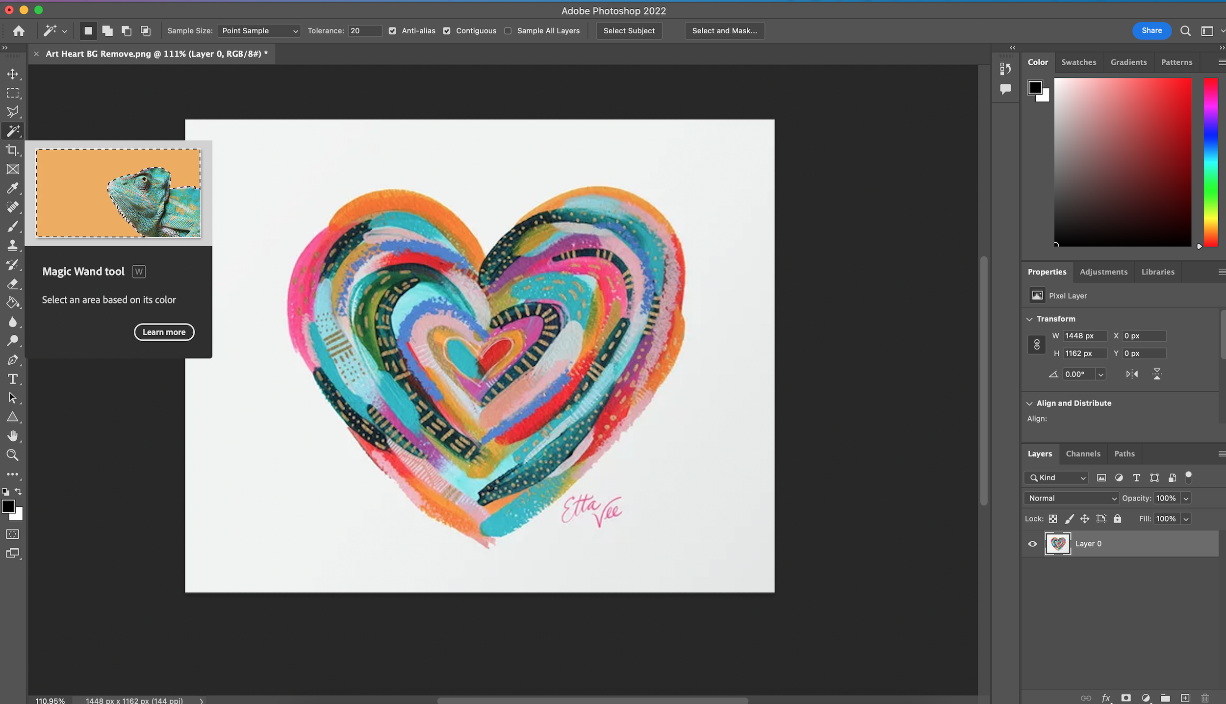 The magic wand tool allows you to automatically select things that are the same color and texture, and since this art heart is on a white background, we’ll be able to easily select it and remove it using this tool.