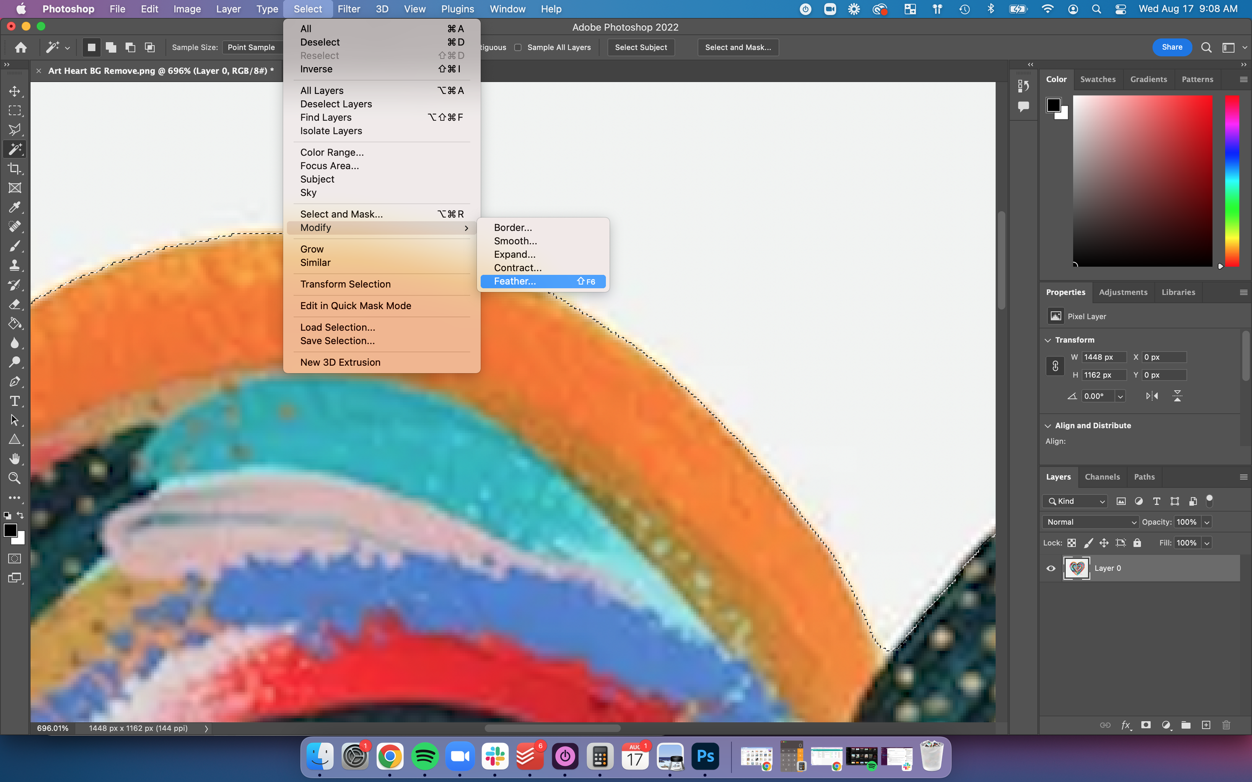 Now there’s one last step to make the selection look more natural. Go back to the select menu and choose Select → Modify → Feather. I generally feather by three pixels as this helps remove any jagged edges and keeps the integrity of the natural brushstrokes. Play around with what works for you, but generally around one to three pixels will work great!