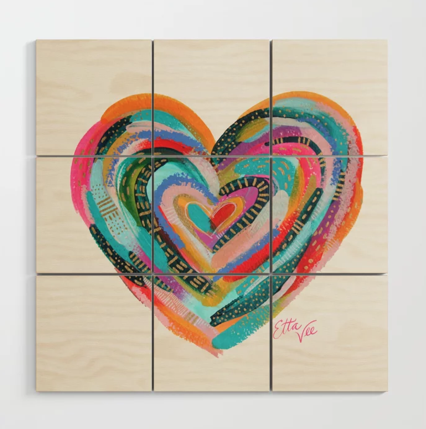 Here is an example of my art heart with a transparent background on a piece of wood wall art on Society6! This tutorial will walk you through the process I took to turn my hand-painted art heart into a file with a transparent background.