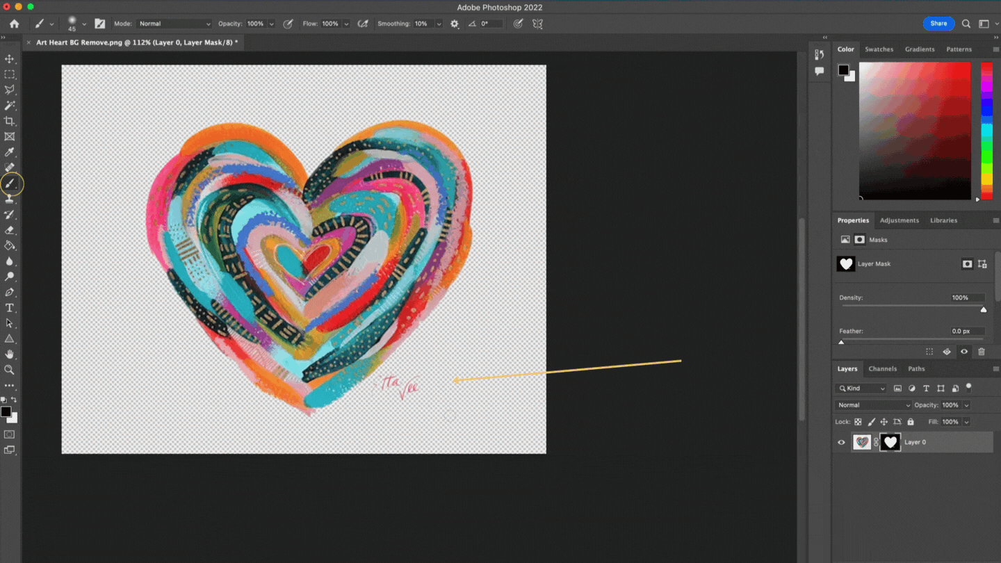 In my example, there are a couple of things we need to do to clean up the final illustration before exporting it. You’ll notice that my signature is still at the bottom of the heart. I want to remove that so the design is on its own. This is super easy to do with a clipping mask!