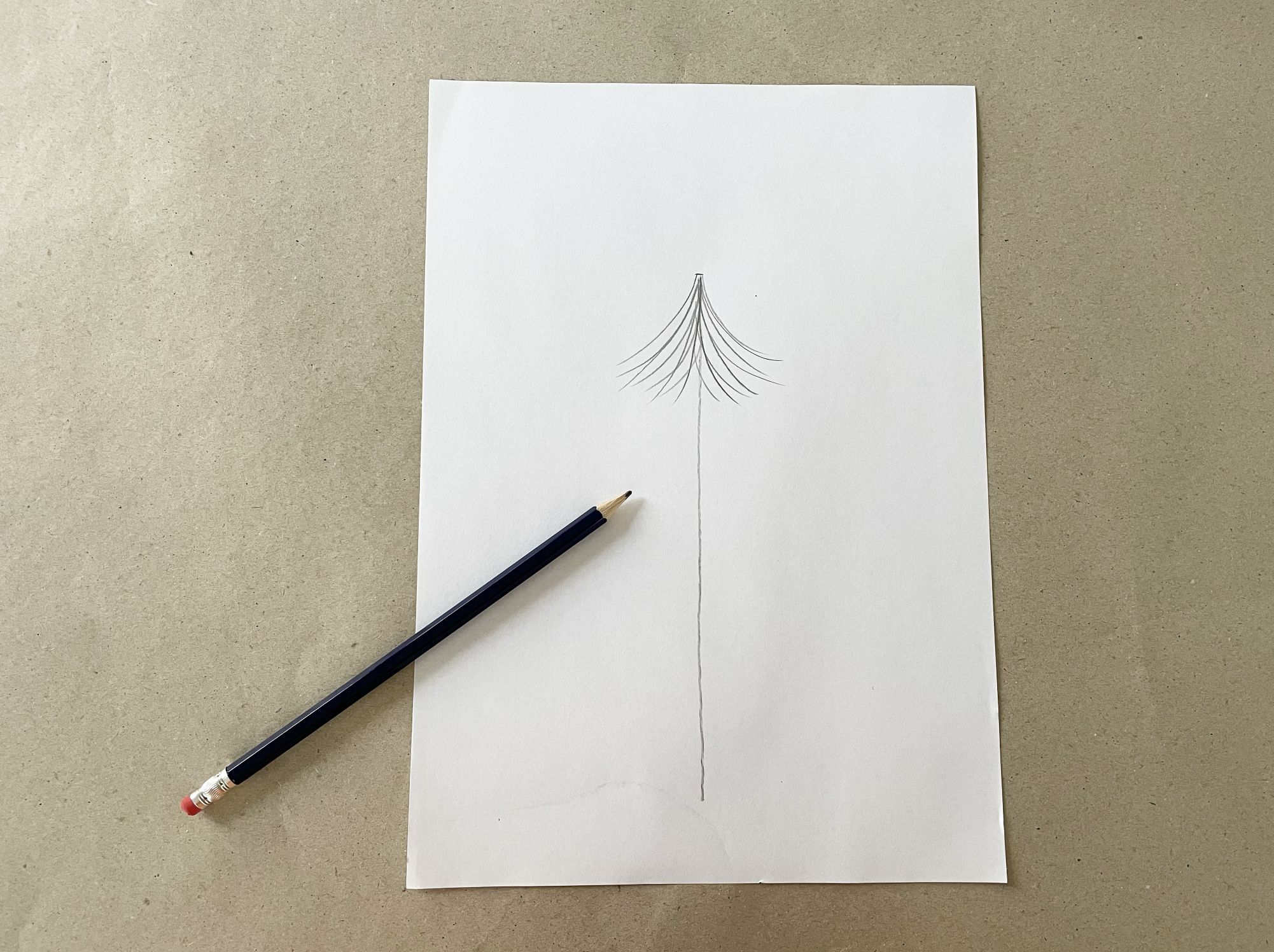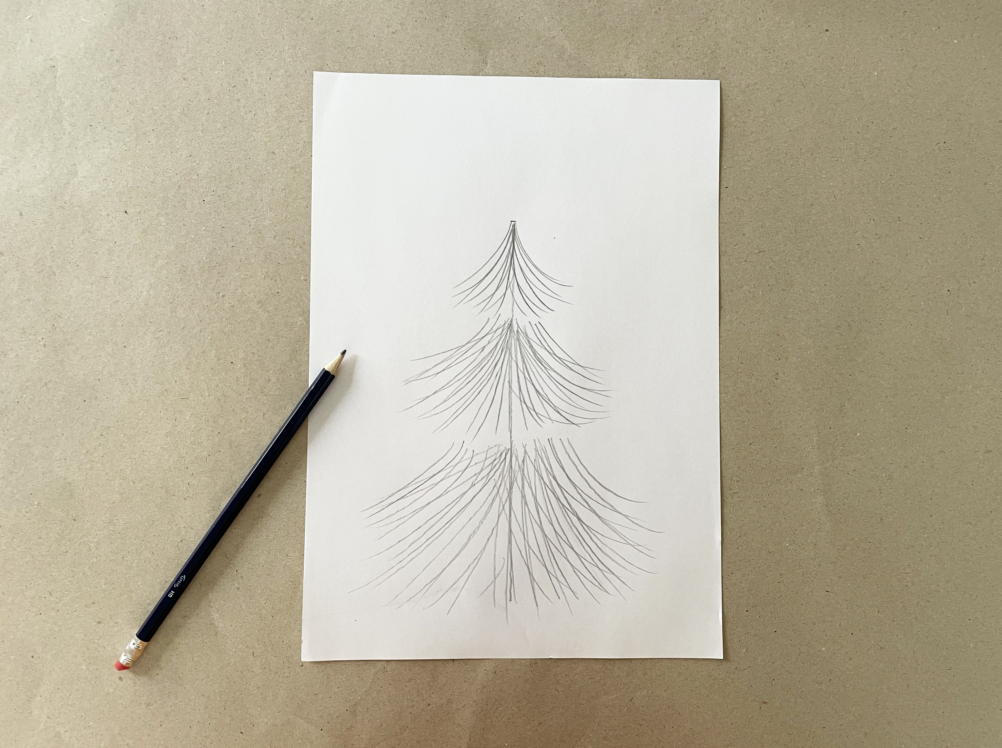 Each layer should fan out larger as we go down. So the top section should be the smallest, the middle section should be slightly larger and the bottom section should fan out the largest. Finish by sketching a radiating star at the top!
